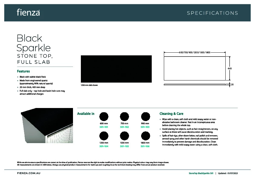 Fienza Black Sparkle Stone Top Full Slab 1800mm X 465mm X 20mm Vanity Cabinet Top 501-106