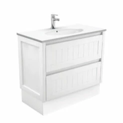 Hampton cabinets feature popular modern-vintage styling with beautifully routered drawer fronts and a smooth satin finish.