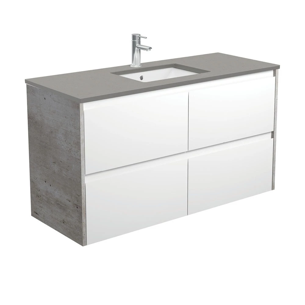 Smooth polished concrete-look engineered quartz stone top. Also available without a cutout for use with above counter basins (see our Stone & Timber Tops range).