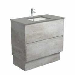 Smooth polished concrete-look engineered quartz stone top. Also available without a cutout for use with above counter basins (see our Stone & Timber Tops range).