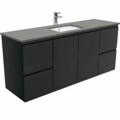 Smooth polished concrete-look engineered quartz stone top. Also available without a cutout for use with above counter basins (see our Stone & Timber Tops range).