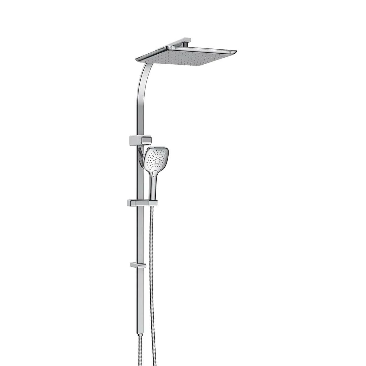 Shower Features 110mm square multi function handset, 280mm x 280mm square overhead wall shower, Adjustable bottom fixing to 800mm, Brass Rail