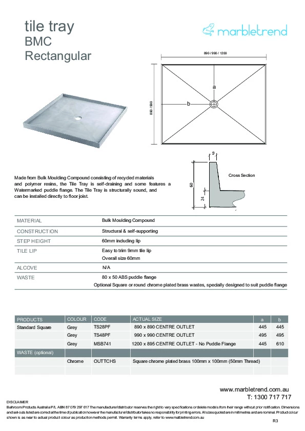 This innovative new product features high compression Bulk Moulding Compound consisting of recycled materials and polymer resins, the Tile Tray is self-draining and some features a Watermarked puddle flange. The Tile Tray is structurally sound, and can be installed directly to floor joist..